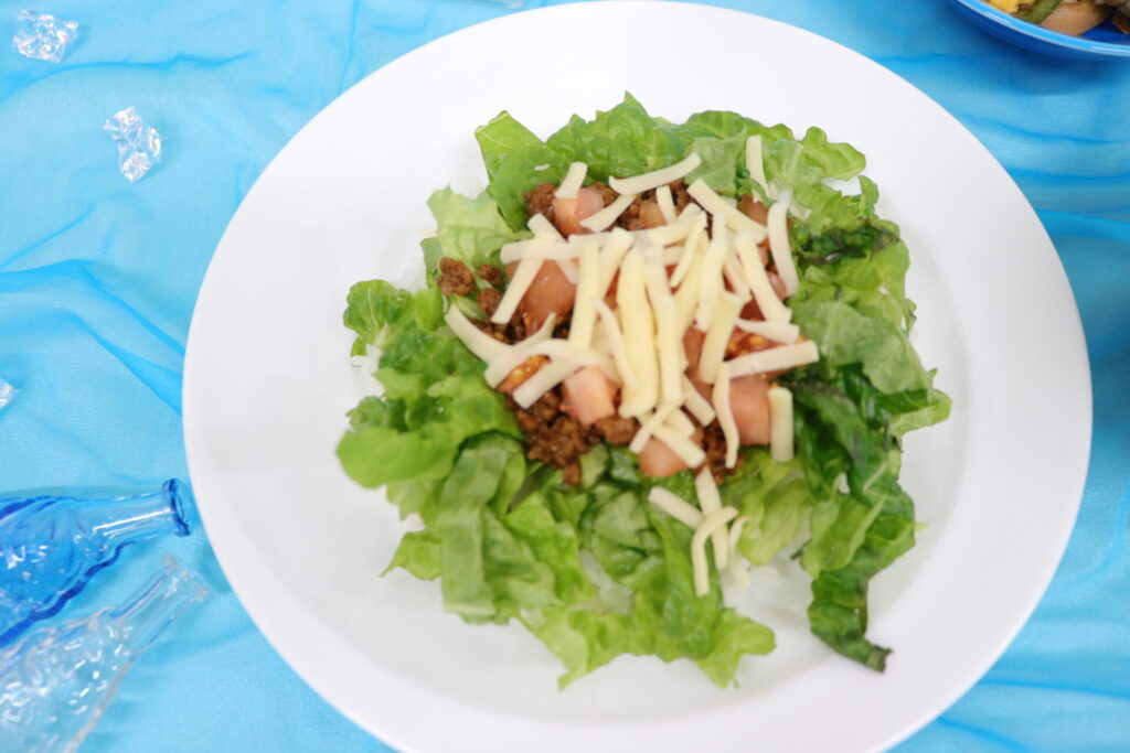 ④器にごはんを盛り、レタス・炒めた挽肉・トマト・シュレッドチーズをのせ、完成。