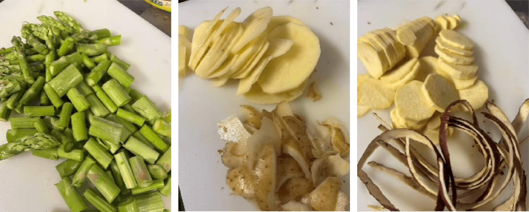 ① 野菜は水で良く洗っておく。アスパラガスは根の固い部分があったら切落し、3㎝幅にカット、ジャガイモ、サツマイモは皮をむいてスライス、玉ネギは皮をむいて芯を取り、繊維を切る様にスライスする。