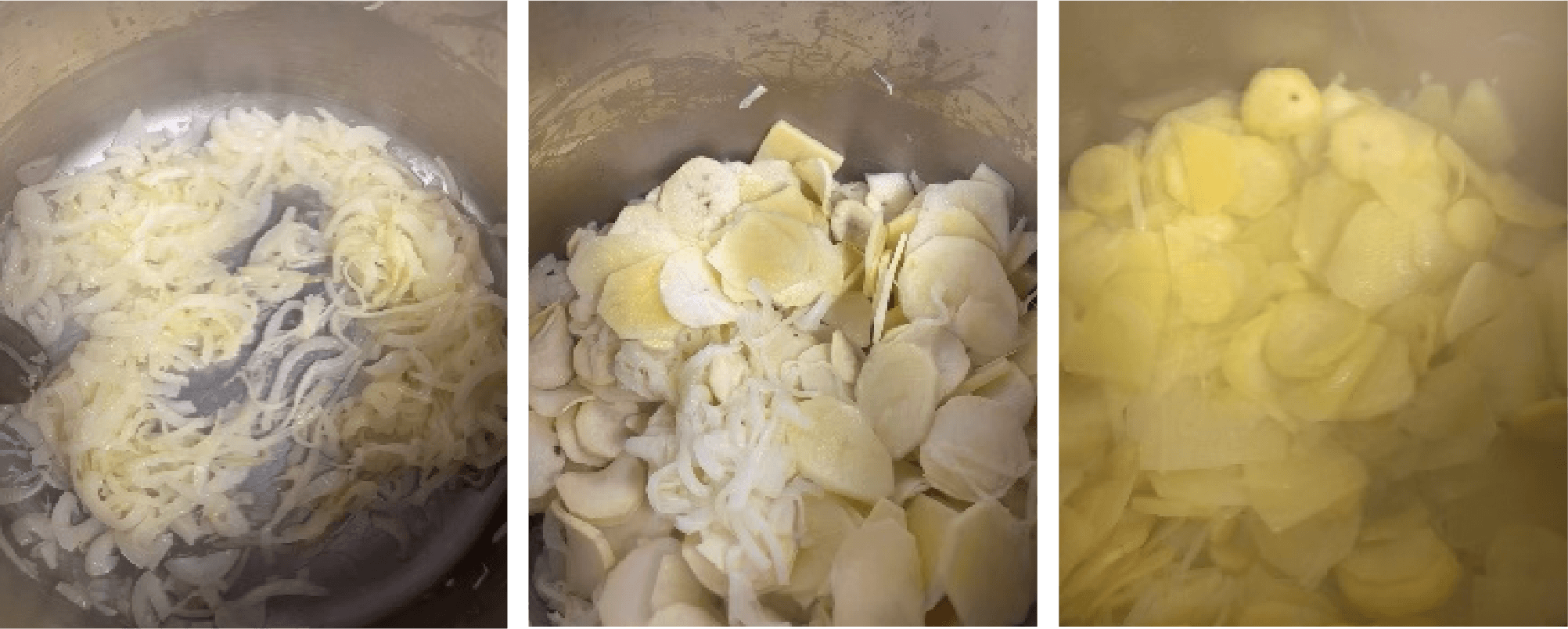 ③ 別鍋にバター、玉ネギを入れて弱火で炒め、水分が無くなって甘味が出て来たらジャガイモとサツマイモを入れて更に炒める。