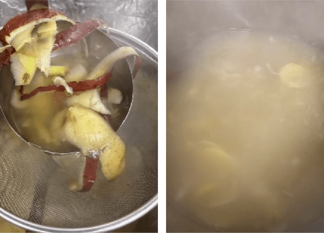 ②鍋に水を張り、①の野菜の皮、根、芯を入れて30分ほど煮出し、ダシを取る。