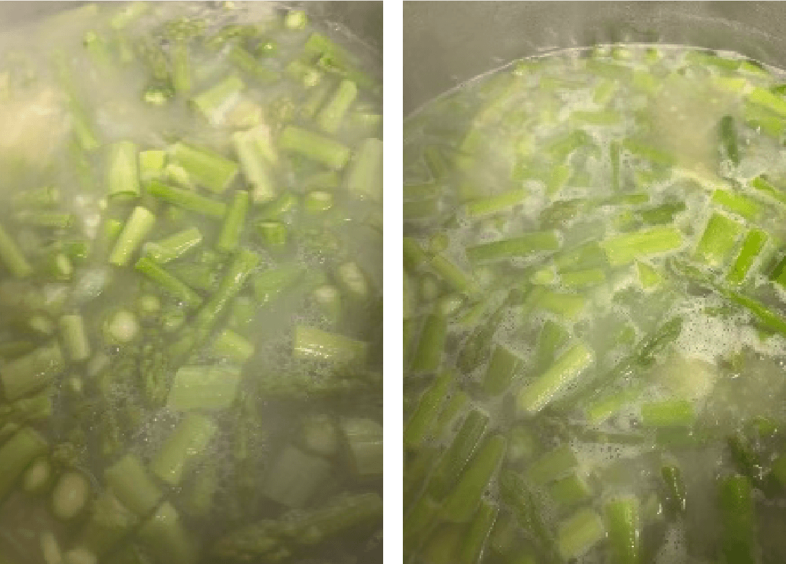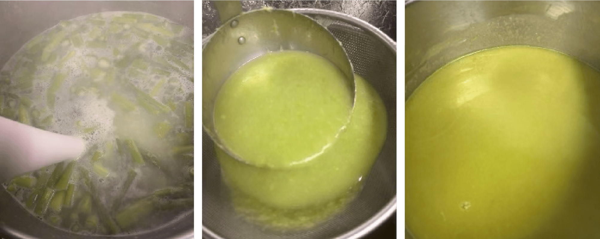 ⑥ アスパラガスの色が鮮やかに出て、火が入ったら火を止めてミキサーで回す。