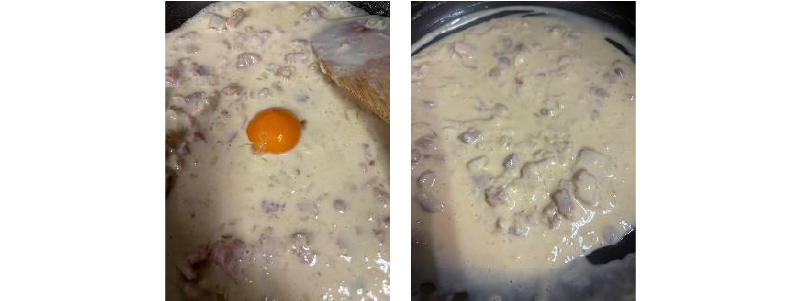 火を止めてから卵黄を加えて素早く混ぜてソースの完成