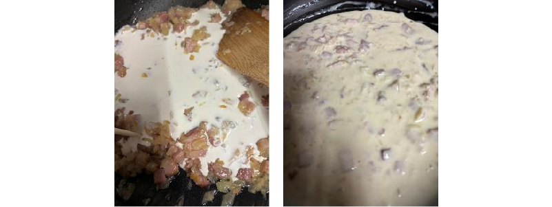 ②フライパンにオリーブオイルと玉ネギ、ニンニク、ベーコンを入れて弱火で炒め、玉ネギがしんなりしてきたら生クリーム、粉チーズ塩コショウを入れてベースソースを作る。