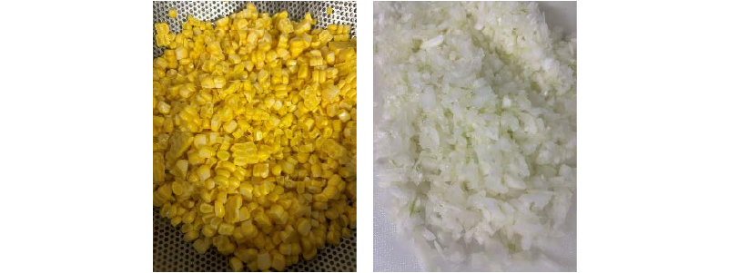 ①玉ネギはみじん切り、トウモロコシは果肉を削ぎ落す。※芯はスープのダシなどでご使用下さい。