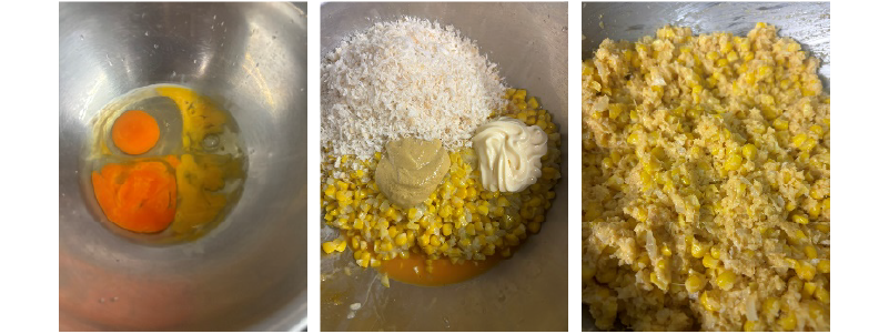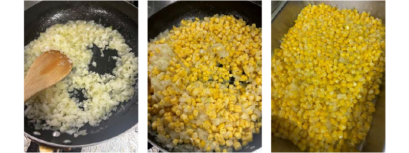 ③フライパンにバター、玉ネギを入れて炒め、透き通って来たらトウモロコシの果肉を加え、塩コショウで味付けをして更に炒める。