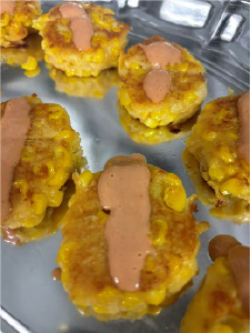 ケーキといってもお菓子のケーキではなく、アメリカ発祥の“クラブケーキ”をカニではなくトウモロコシでアレンジしてみました。このケーキ独特のモサモサ食感に、トウモロコシの甘さとシャキシャキ食感がよく合う、チョットお酒が進みそうなメニューです。