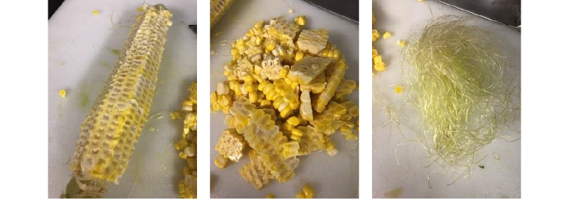 ①とうもろこしは皮を取り、実に付いているひげは細かく切る。果肉の部分を包丁で削り取る。