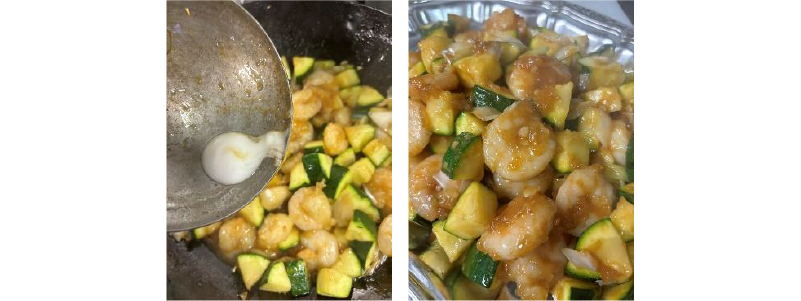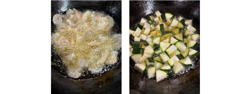 ②フライパンに油を熱し、①の海老を入れて油通しをし、8分目くらいまで火を入れザルにあげる。同じくズッキーニも油通しで8分目くらい火を入れてザルにあげる(油通しではなく、フライパンでそれぞれを炒めて火を通してもOKです)。