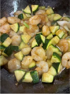 ③フライパンを熱して油を入れ、長ネギを焼き目が付くくらいまで炒めたらネギだけ取り、残った油でニンニクを弱火で炒める。ニンニクの香りが出て来たらバターを加え、バターの風味を付ける様に炒めたら②の海老とズッキーニ、長ネギを加えて炒め合わせる。