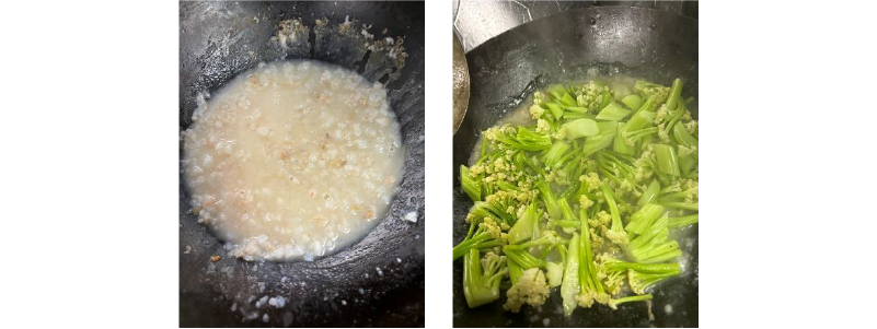 ③フライパンに油をしいてニンニクを炒めて香りを出し、海老を加えて炒める。海老に火が入ったらガラスープを加えて塩コショウで味付けをする。