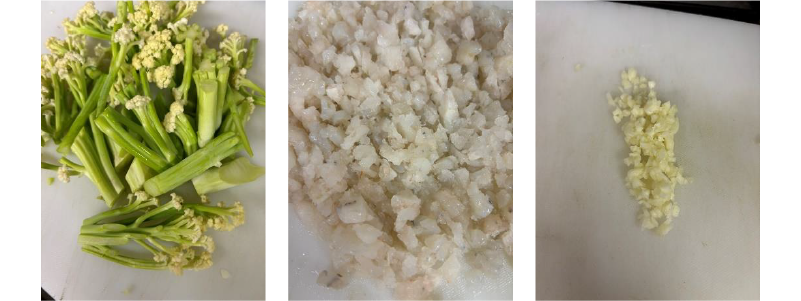 ①カリフローレは一口サイズに切り分け、ニンニクはみじん切り、海老は粗目のみじん切りにする。