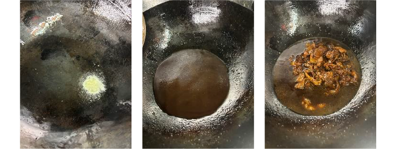 ③②に甜面醤、醤油、日本酒、砂糖を入れて焦がさない様に混ぜ炒める。