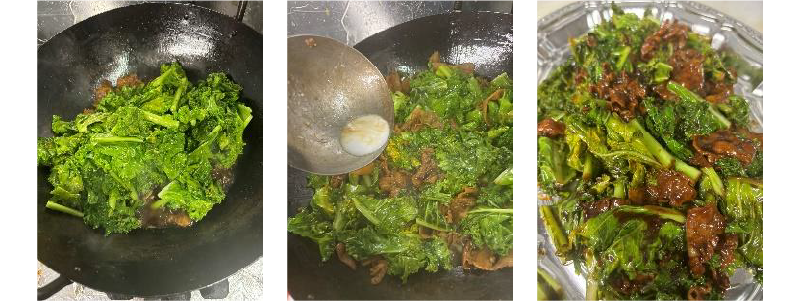 ケールを加えて炒め、水溶き片栗粉でとろみを付けたらゴマ油を混ぜて完成