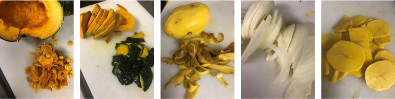 ①かぼちゃは種を取って皮をむき、3cmはば程にカット(種はだしを取ります。皮はキンピラやせんべいなどに使用できます)。ジャガイモは皮をむき、1cm幅に輪切り、玉ねぎはスライスする。