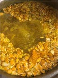 かぼちゃの種とワタ、ジャガイモの皮などを煮出してブイヨンを取り