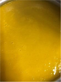 野菜ブイヨンを加えて煮込み、かぼちゃが柔らかくなったらミキサーで白ゴマ、白味噌と一緒に回して鍋に戻す