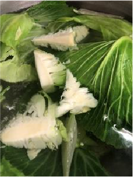 ②鍋に水を入れ、キャベツの芯と外側の固い数枚を入れて煮出してダシを取る。