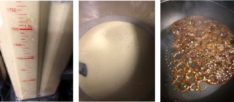 ⑥グラニュー糖をフライパンで焦がして⑤に加え、牛乳と生クリームでのばして塩コショウで味を調える。最後にバターを加えて沸いたら完成。