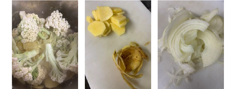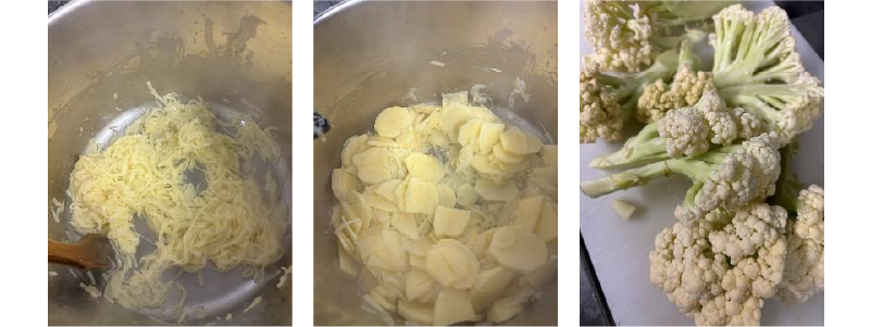 玉ネギ、ジャガイモを炒めてカリフローレを合わせ
