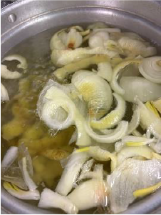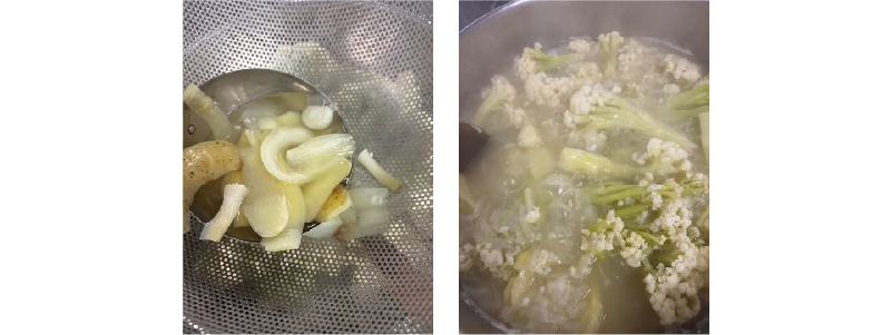②鍋に水を張り、①で出た玉ネギの皮や芯、ジャガイモの皮を入れて弱火で30分ほど煮出し、野菜ダシを取る。
