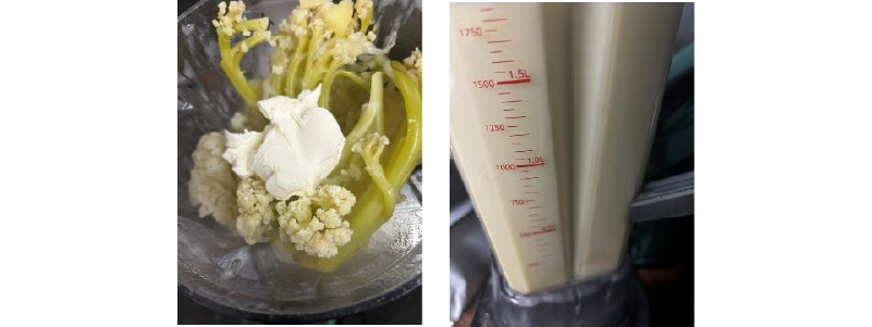 ⑥カリフローレが全体的にしんなりしてきたら、マスカルポーネと一緒にミキサーで回して鍋に戻し、加熱する。砂糖、塩コショウで味付けをし、灰汁を取ったら火を止め、粗熱を取って冷蔵庫で冷やす。