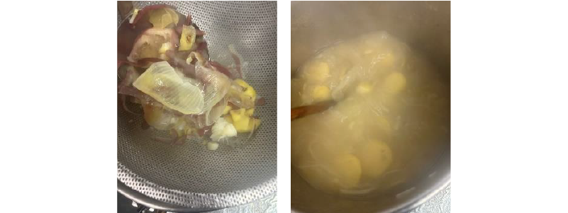 ②鍋に水を張り、①の玉ネギの厚い皮や芯、サツマイモの皮、桃の種を入れて煮出し、野菜ダシを取る。