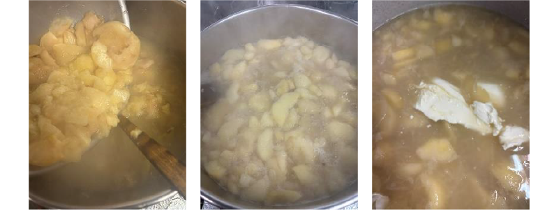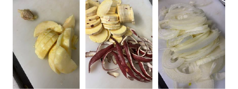 ①玉ねぎは繊維を切る様にスライス、サツマイモは水でよく洗って皮をむき、2㎜厚にスライスして水に漬ける。桃は皮をむいて種を取り、ざく切りにする。サツマイモの皮、桃の種はダシに使う。