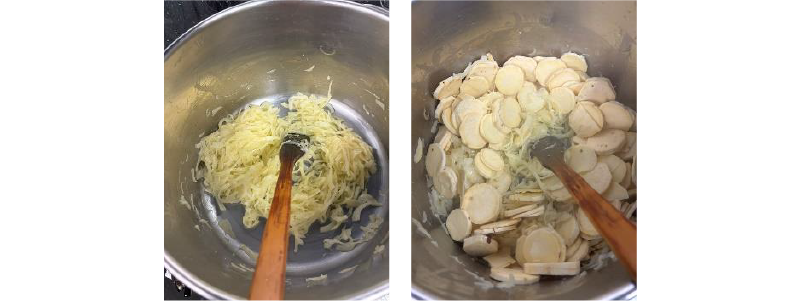 ③別鍋にバターと玉ネギを入れ、色が付かない様に弱火で炒め、玉ネギの甘味が出て来たらサツマイモを入れて軽く炒める。サツマイモに火が入って来たら砂糖を入れ、全体にコーティングする様に炒め絡める。