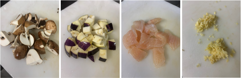 ①ブラウンマッシュは1/4、フィレンツェ、ナマズは3㎝角、ニンニク生姜はみじん切りにする。