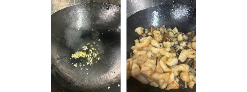 ④フライパンを熱して油を入れ、ニンニク・生姜を炒めて香りを出したら②の油通ししたナマズと野菜を入れて炒め、水、塩コショウで味付けをする。