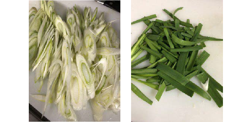 ②長ネギは斜めにスライス、ニラは4cmの長さにカットする。