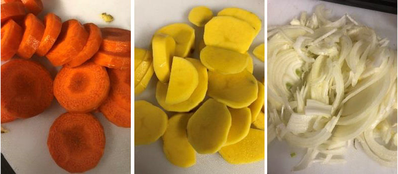 ①人参とジャガイモは、スポンジなどを使って水でよく洗って皮をむき(皮はブイヨンに使います)、1.5cm幅の輪切りに、玉ネギは繊維を切る様にスライスする。