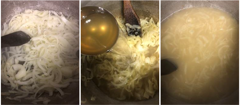 ④別鍋で玉ねぎとバターを弱火で炒めて甘みを出し、水分が無くなって来たらジャガイモ、②の野菜ブイヨンを入れて15分ほど煮込む。