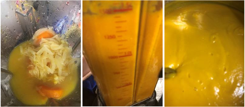 ⑤ミキサーに③のグラッセと④のブイヨンを入れて回し、鍋に入れる。