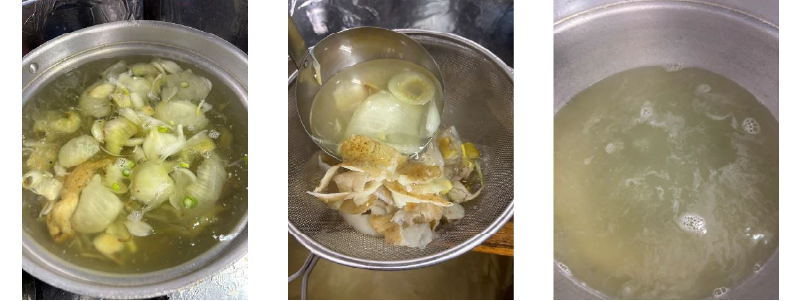 ②鍋に水を張り、①の野菜の皮などを煮出して野菜ブイヨンを取る。