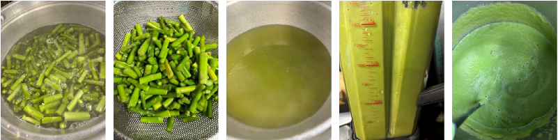 ③②の野菜ブイヨンでカットしたアスパラガスを軽く茹でて冷まし、ミキサーで回してピューレを作って冷蔵庫で冷ます(ミキサーが回りにくかったら冷ました野菜ブイヨンを加えて回してください)。
