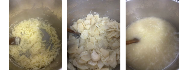 ④別鍋で玉ネギをバターで炒め、水分が無くなって甘味が出て来たらジャガイモを加えて更に炒め、②の野菜ブイヨンを濾して加えて塩コショウをして15 分ほど煮込む。