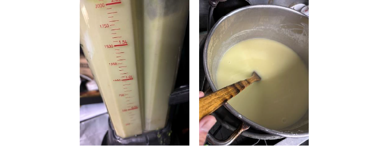 ⑥③のアスパラガスピューレと⑤のポタージュベースがしっかり冷めたらボウルなどで合わせ、牛乳と生クリームで伸ばし、塩コショウで味を調えて完成。
