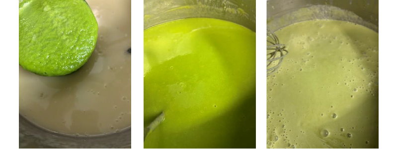 ポタージュベースとアスパラガスのピューレを合わせ、牛乳・生クリームで伸ばして塩コショウで味を調えて完成