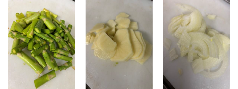 ①アスパラは4㎝幅に、玉ねぎはスライス、ジャガイモは良く洗ってから皮をむき、薄くスライスする。玉ねぎの芯と固い皮、ジャガイモの皮は取っておく。