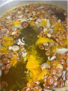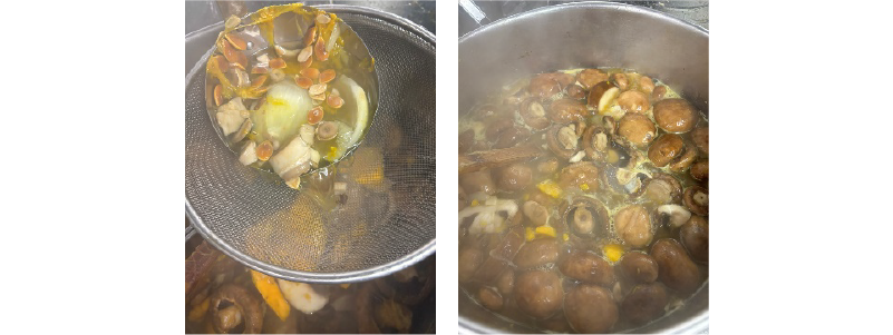 ②鍋に水、マッシュルームの石突、ロロンの種とワタ、玉ネギの芯・少し色のついた皮を入れて加熱し、弱火で30分ほど煮出して野菜ダシを取る。