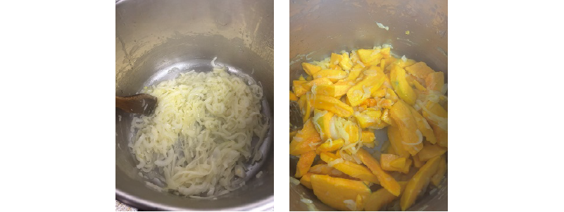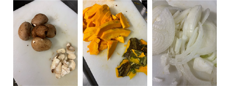 ①ブラウンマッシュは石突の固いところをカットし、濡らしたフキンで表面や裏側に付いている土を拭く。ロロンは種とワタを取り、皮をむいて1cm厚にカット、玉ネギは繊維を切る様にスライスする。