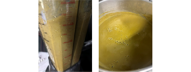 ミキサーで回して鍋に戻し、牛乳、生クリームを加えて灰汁を取り、味を調整する