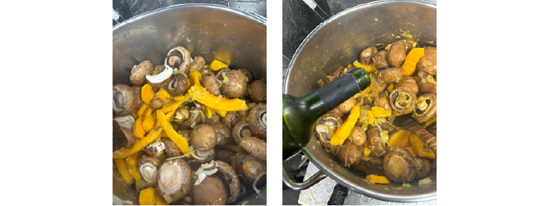 ④マッシュルームが軽くしんなりしてきたら白ワインを振り、馴染ませながらアルコール分を飛ばしたら②の野菜ダシを濾して加え、煮込む。