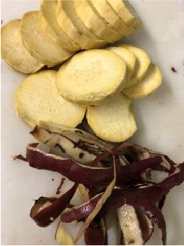 ②鍋に水を入れ、①のサツマイモの皮をフライパンで焼いて焦げ目が全体的に付いたら加えて30~40分ほど煮出し、ダシを取る。