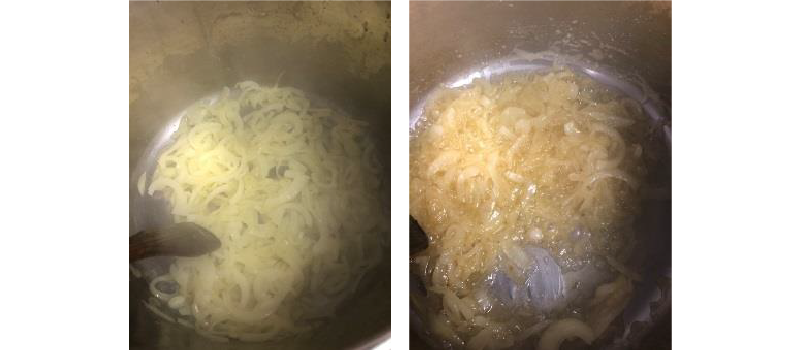 ③鍋にバターと玉ネギを入れて弱火で炒め、やや色が付いてきたらグラニュー糖を加えて絡ませる様に炒める。