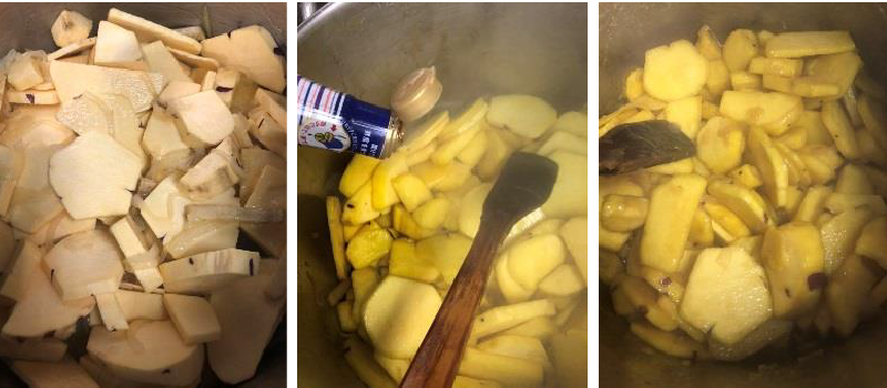 ⑤サツマイモが軽く透き通る位に火を入れたら②の野菜ダシを漉して入れて、そのまま煮込む。