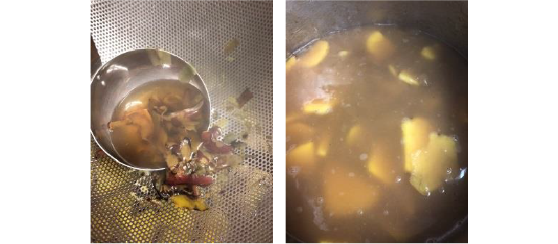 皮は水で洗い、フライパンで素焼きにして焦げ目を付けてから煮出して、ダシを取る