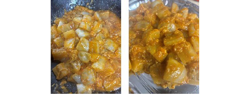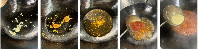 ③フライパンを熱して油を入れ、ニンニク・生姜を入れて炒める。香りが出て来たら豆板醤を入れ焦がさない様に炒めたら料理酒、水、ケチャップ、砂糖、塩、酢、醤油、甘酒を入れてしっかり火を入れる。