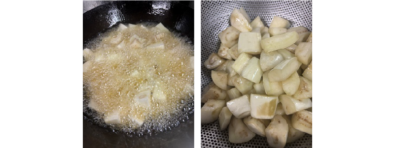 ②ラテを油で揚げて油通しをし、8割ほど火を入れてザルで油を切る(フライパンで多めの油で焼いてもOK)